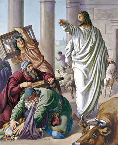 월요일 아침이 되자 주님은 성전으로 향하셨습니다. 성전에서 들어가셔 난장판이 되어 있는 성전을 보셨습니다. 주님은 채찍을 만들어 성전 안에서 매매하는 이들을 쫓아내셨고 상과 의자를 둘러 엎으셨습니다. 그리고 이렇게 말씀하셨습니다.