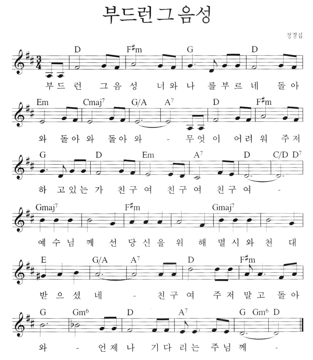 4-50대 장년이 부르기 좋은 찬양을 선별해 봅니다. 그 첫 찬양으로 '부드런 그 음성'입니다. 3/4박 느린 찬양으로 마음을 고백하며 부르기에 좋은 곡입니다. 내용은 자신의 친구에게 주님을 소개합니다.