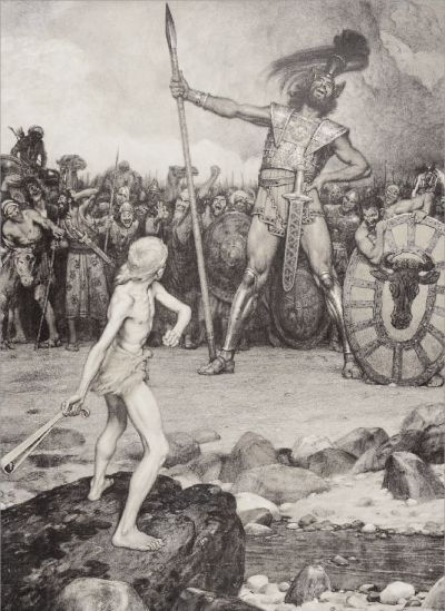 골리앗(히브리어: גָּלְיָת, '골랴트')은 사무엘상 17장에서 등장하는 블레셋의 거대한 전사입니다. 그는 키가 여섯 규빗 한 뼘(약 2.9m)이나 되었고, 강력한 무기를 소유한 무적의 전사였습니다. 그러나 다윗은 하나님을 의지하며 물맷돌 하나로 그를 쓰러뜨렸습니다(사무엘상 17:50 "다윗이 이같이 물매와 돌로 블레셋 사람을 이기고 그를 쳐 죽였으나 자기 손에는 칼이 없었더라"). 이 사건은 신앙의 힘이 물리적인 힘보다 더 강력하다는 메시지를 전하며, 믿음이 있는 자는 어떤 강한 대적도 이길 수 있음을 보여줍니다.