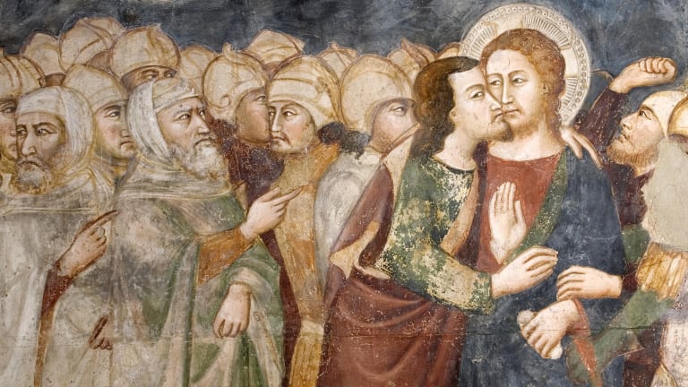 가룟 유다는 예수님을 은 이십에 팔았다. 예수님의 볼에 키스를 하면 그가 예수인줄 알고 잡으라는 계획을 세우고 실천헤 옮긴다. 평안을 구하는 키스가 배신의 키스, 죽음의 키스가 된다. 그는 결국 목대어 자살하고, 창자가 쏟아진다.