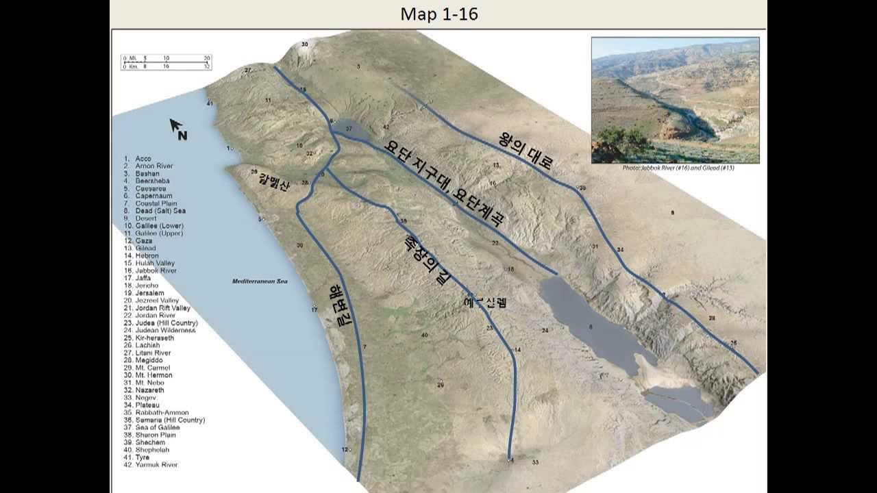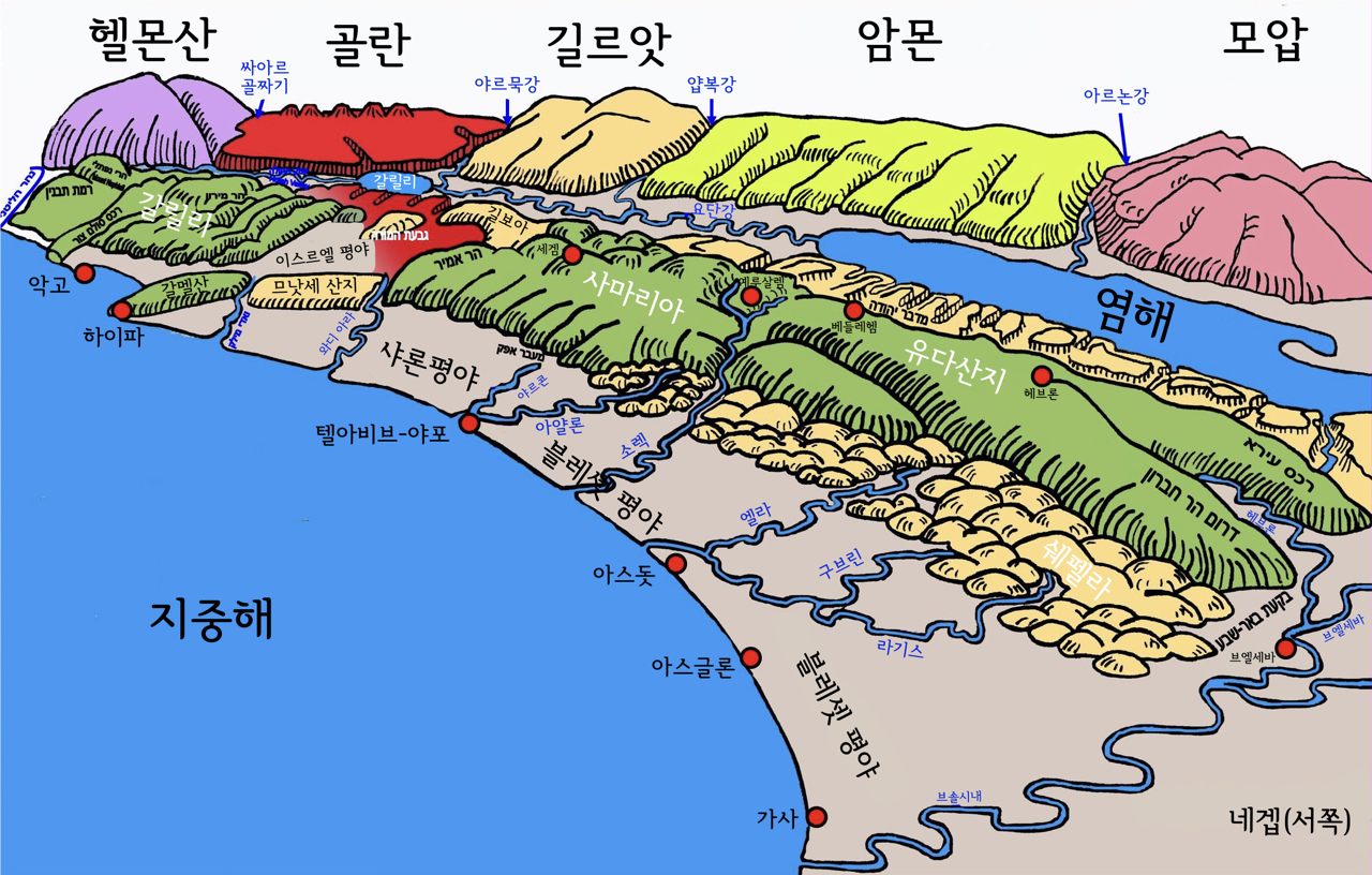 예루살렘을 중심으로 아래로는 남유다 왕국이 자리하게 되고, 북쪽으로는 북이스라엘이 자리합니다. 물론 이것은 솔로몬 왕 이후 분열된 이스라엘을 두고 말합니다. 지형은 우리나와 비슷합니다. 서쪽은 지중해가 있어 해변가로 평지가 많습니다. 샤론 평야, 세펠라 평야가 있습니다. 이곳은 대부분 블레셋이 차지하고 있습니다. 블레셋은 다윗 시대에 가서야 평정이 됩니다.