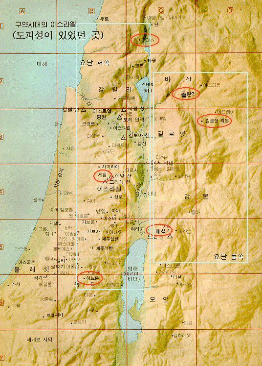 [수 20:7-9] 7 이에 그들이 납달리의 산지 갈릴리 게데스와 에브라임 산지의 세겜과 유다 산지의 기럇 아르바 곧 헤브론과 8 여리고 동쪽 요단 저쪽 르우벤 지파 중에서 평지 광야의 베셀과 갓 지파 중에서 길르앗 라못과 므낫세 지파 중에서 바산 골란을 구별하였으니 9 이는 곧 이스라엘 모든 자손과 그들 중에 거류하는 거류민을 위하여 선정된 성읍들로서 누구든지 부지중에 살인한 자가 그리로 도망하여 그가 회중 앞에 설 때까지 피의 보복자의 손에 죽지 아니하게 하기 위함이라