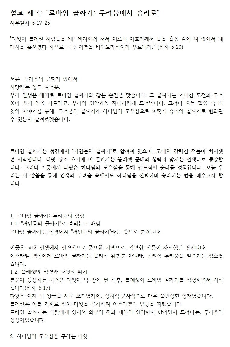 설교 제목: "르바임 골짜기: 두려움에서 승리로"