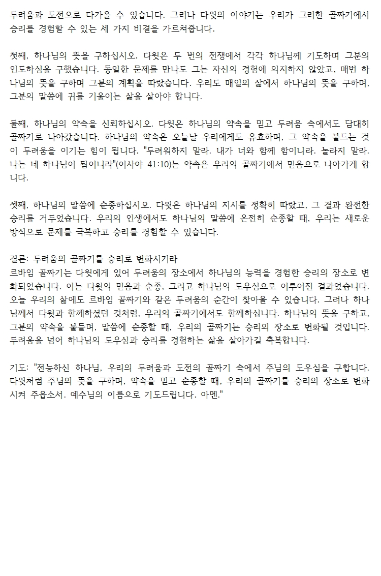 기도: "전능하신 하나님, 우리의 두려움과 도전의 골짜기 속에서 주님의 도우심을 구합니다. 다윗처럼 주님의 뜻을 구하며, 약속을 믿고 순종할 때, 우리의 골짜기를 승리의 장소로 변화시켜 주옵소서. 예수님의 이름으로 기도드립니다. 아멘."