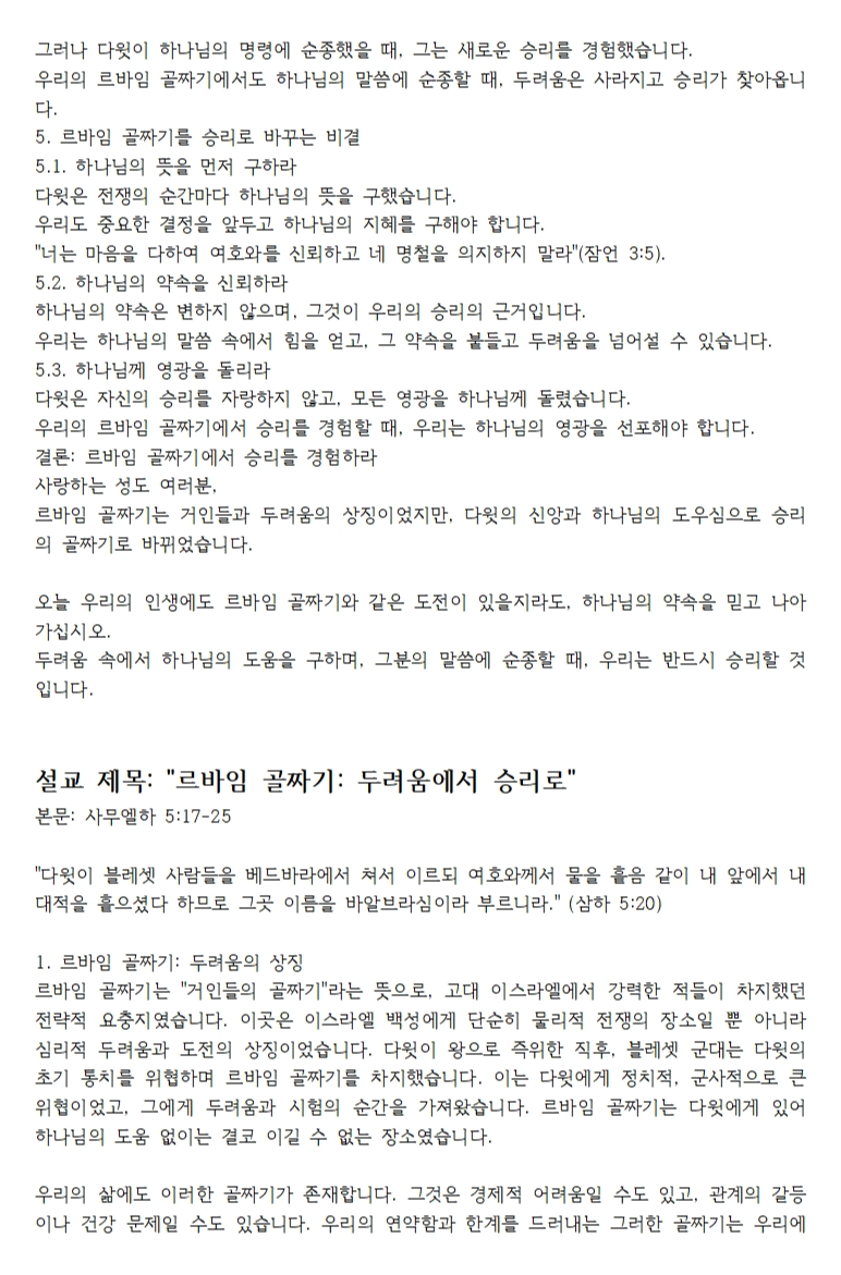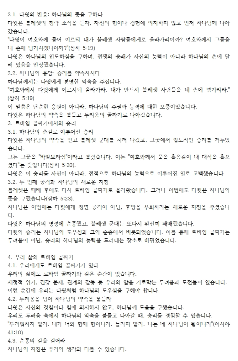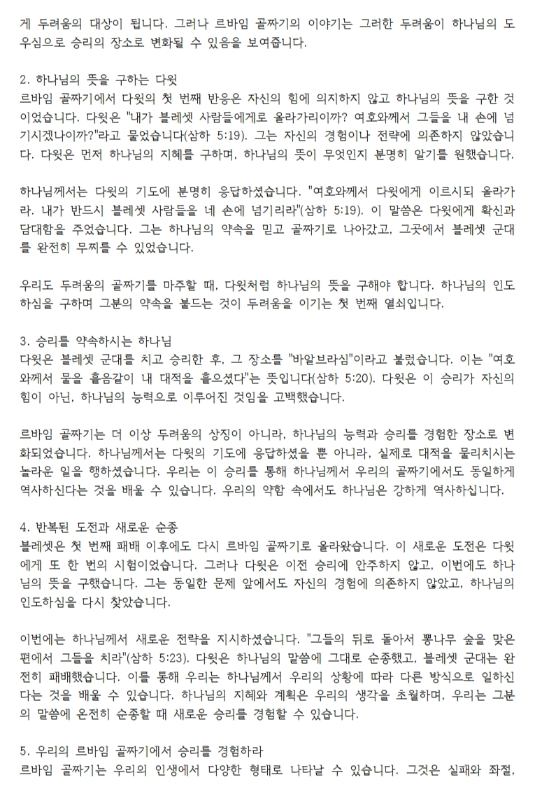 르바임 골짜기는 다윗에게 있어 두려움의 장소에서 하나님의 능력을 경험한 승리의 장소로 변화되었습니다. 이는 다윗의 믿음과 순종, 그리고 하나님의 도우심으로 이루어진 결과였습니다. 오늘 우리의 삶에도 르바임 골짜기와 같은 두려움의 순간이 찾아올 수 있습니다. 그러나 하나님께서 다윗과 함께하셨던 것처럼, 우리의 골짜기에서도 함께하십니다. 하나님의 뜻을 구하고, 그분의 약속을 붙들며, 말씀에 순종할 때, 우리의 골짜기는 승리의 장소로 변화될 것입니다. 두려움을 넘어 하나님의 도우심과 승리를 경험하는 삶을 살아가길 축복합니다.