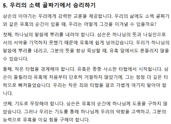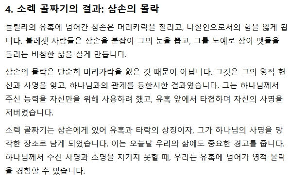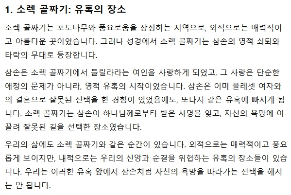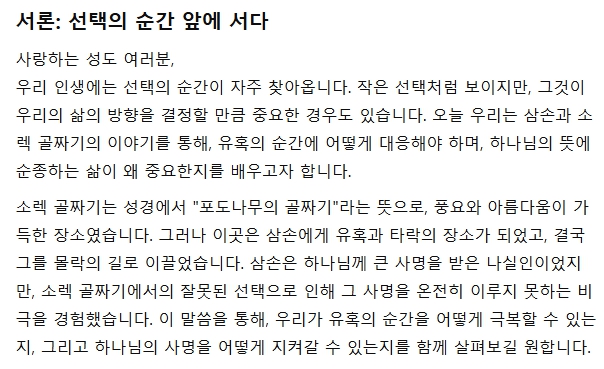 사랑하는 성도 여러분, 소렉 골짜기는 삼손에게 유혹과 타락의 장소로 남았습니다. 그러나 오늘 우리는 이 이야기를 통해 우리의 삶에서 소렉 골짜기를 승리의 장소로 변화시킬 수 있습니다. 유혹 앞에서 하나님의 말씀을 붙들고, 작은 타협을 경계하며, 기도로 하나님을 의지할 때, 우리는 소렉 골짜기에서도 하나님의 도우심을 경험할 수 있습니다. 오늘 우리의 삶 속에서 유혹의 순간마다 하나님의 뜻을 기억하며, 믿음으로 승리하는 삶을 살아가길 축복합니다.