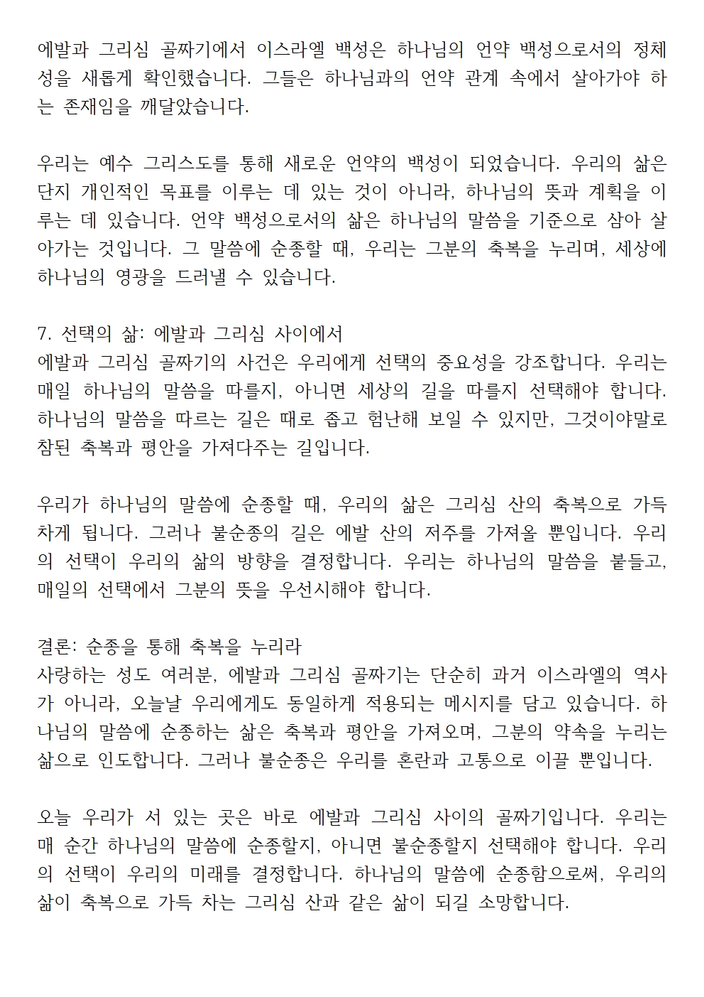 사랑하는 성도 여러분, 에발과 그리심 골짜기는 단순히 과거 이스라엘의 역사가 아니라, 오늘날 우리에게도 동일하게 적용되는 메시지를 담고 있습니다. 하나님의 말씀에 순종하는 삶은 축복과 평안을 가져오며, 그분의 약속을 누리는 삶으로 인도합니다. 그러나 불순종은 우리를 혼란과 고통으로 이끌 뿐입니다.