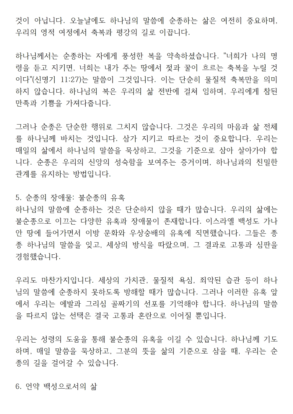 그러나 순종은 단순한 행위로 그치지 않습니다. 그것은 우리의 마음과 삶 전체를 하나님께 바치는 것입니다. 삼가 지키고 따르는 것이 중요합니다. 우리는 매일의 삶에서 하나님의 말씀을 묵상하고, 그것을 기준으로 삼아 살아가야 합니다. 순종은 우리의 신앙의 성숙함을 보여주는 증거이며, 하나님과의 친밀한 관계를 유지하는 방법입니다.