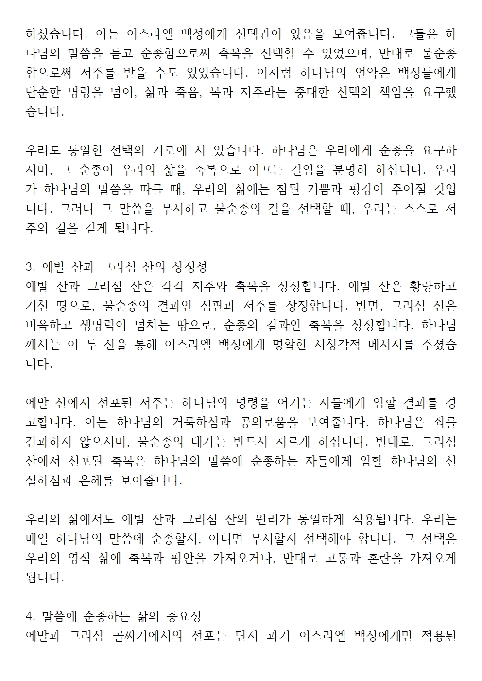에발과 그리심 골짜기에서의 선포는 단순한 의식이 아니었습니다. 그것은 하나님의 말씀에 순종하는 자에게 주어질 복과, 불순종하는 자에게 임할 저주의 결과를 분명히 보여주는 장면이었습니다.