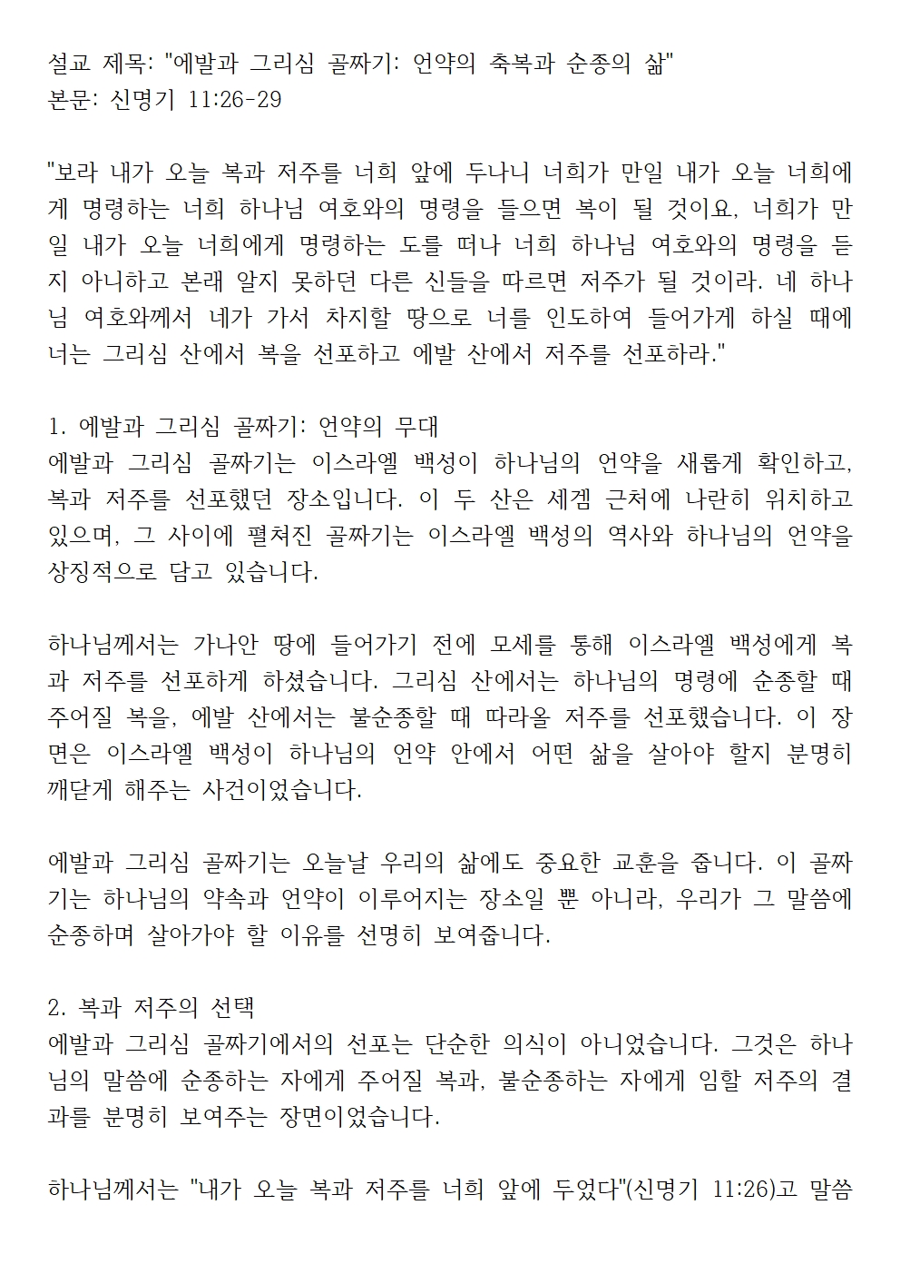 설교 제목: "에발과 그리심 골짜기: 언약의 축복과 순종의 삶"