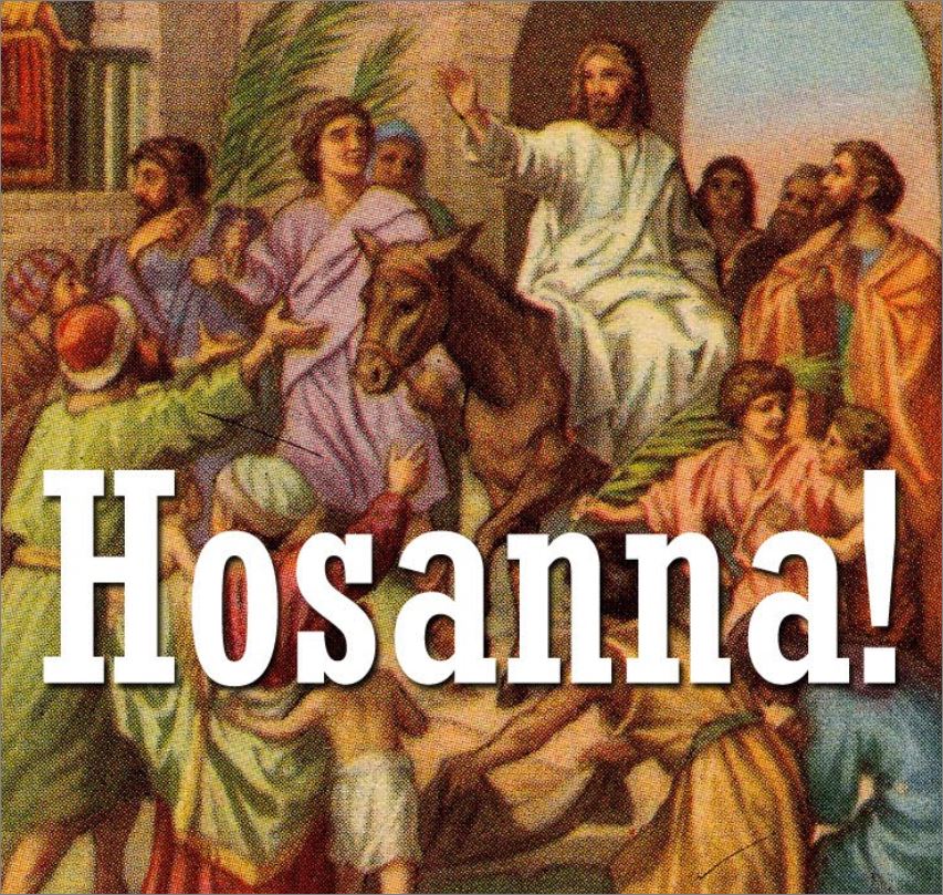 호산나의 뜻은 '우리를 구원하소서'입니다. 예수님께서 예루살렘에 입성하실 때 유월절 행사차 예루살렘에 왔던 사람들이 외쳤던 구호입니다.