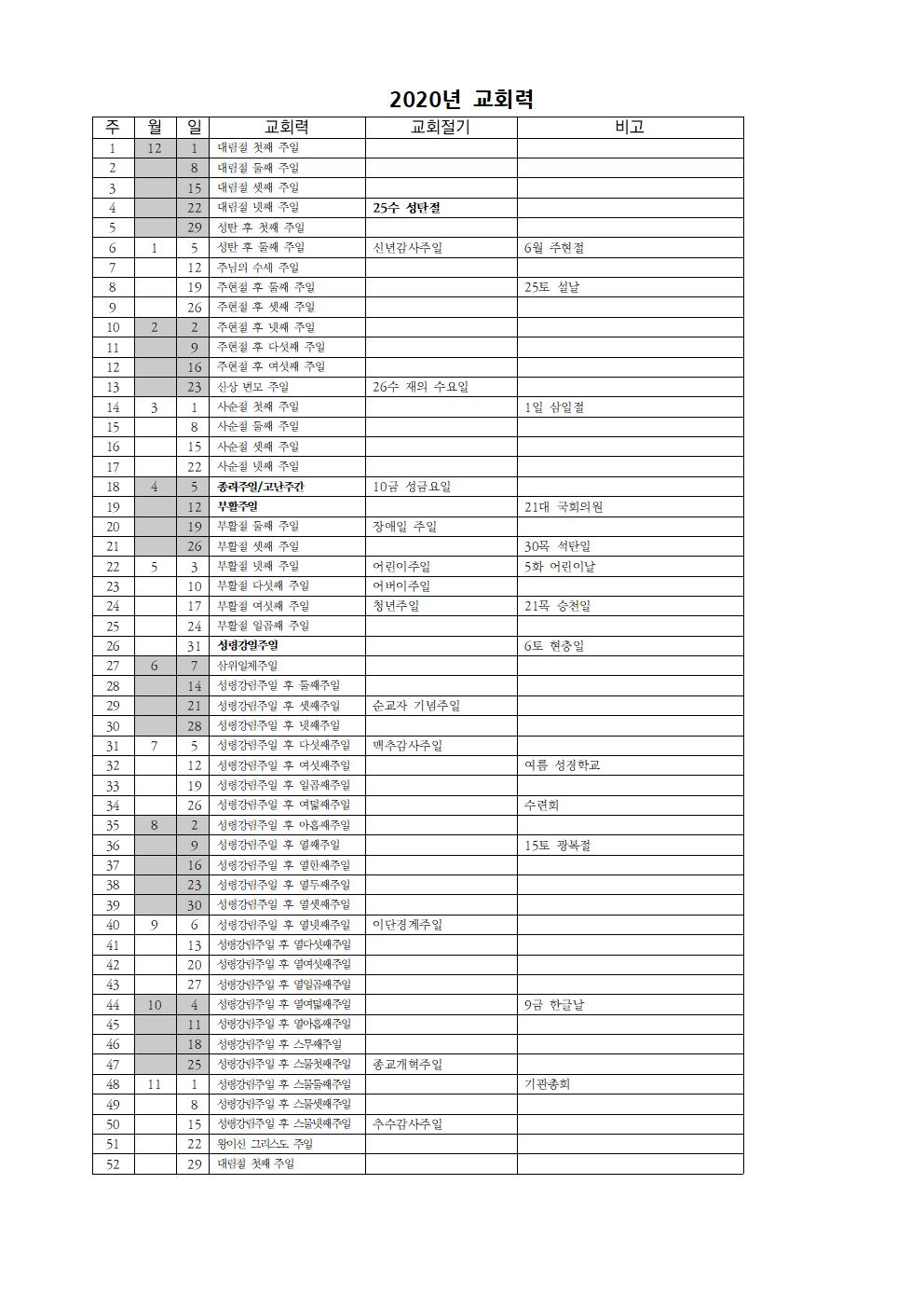 2020년 교회력과 교회 절기를 표시한 한글 파일입니다. 한글 파일도 함께 첨부하니 각자 원하시는 대로 수정하여 사용하시면 됩니다. 교회력을 가톨릭의 것이라고 주장하는 이들이 있는데 교회사를 잘 모르는 소리입니다. 비록 가톨릭의 것이 일부 있기는 하지만 교회력은 초대교회로부터 전승된 것입니다.
