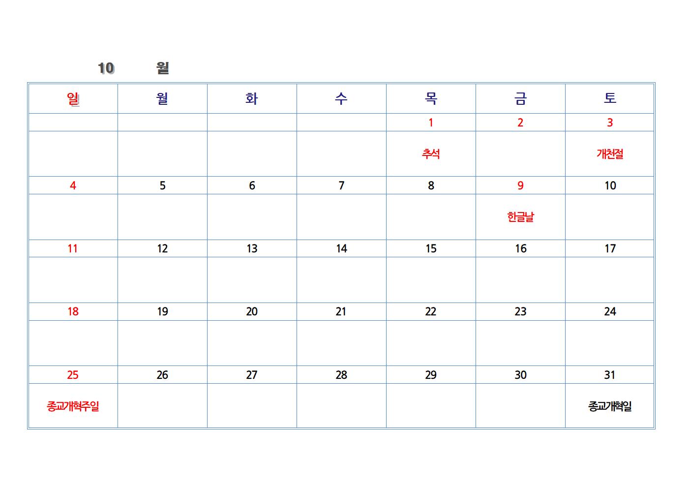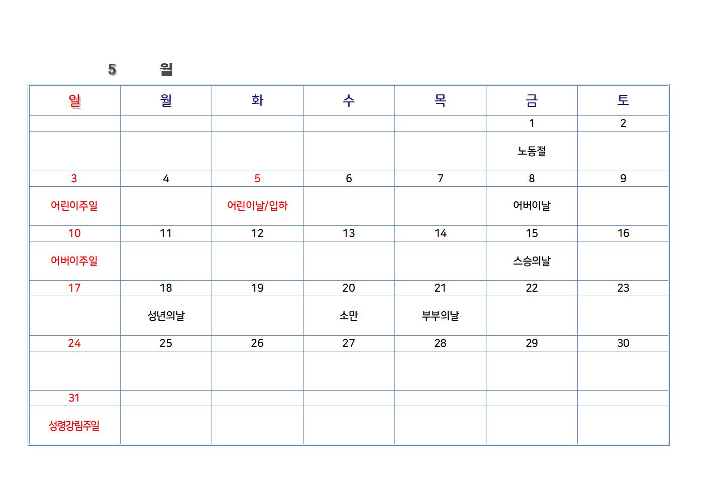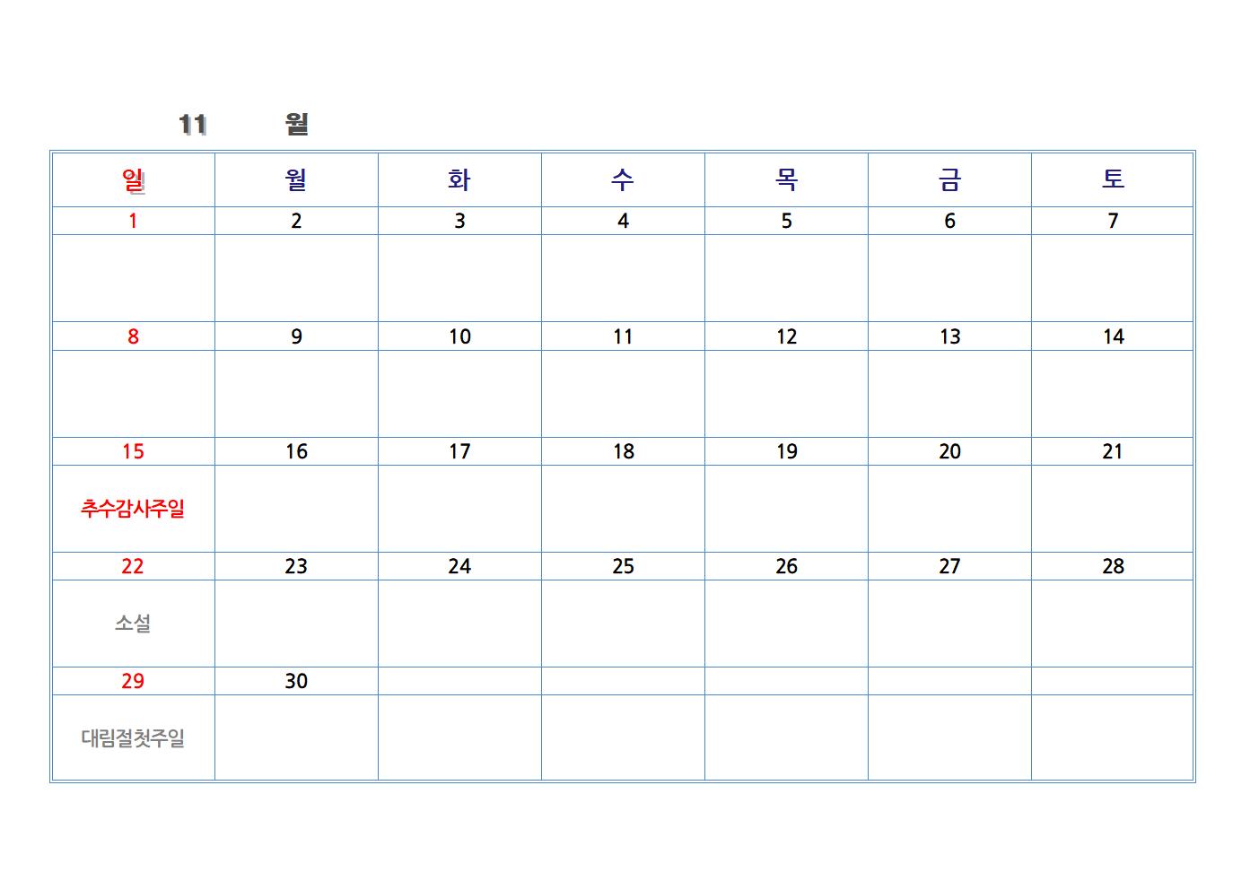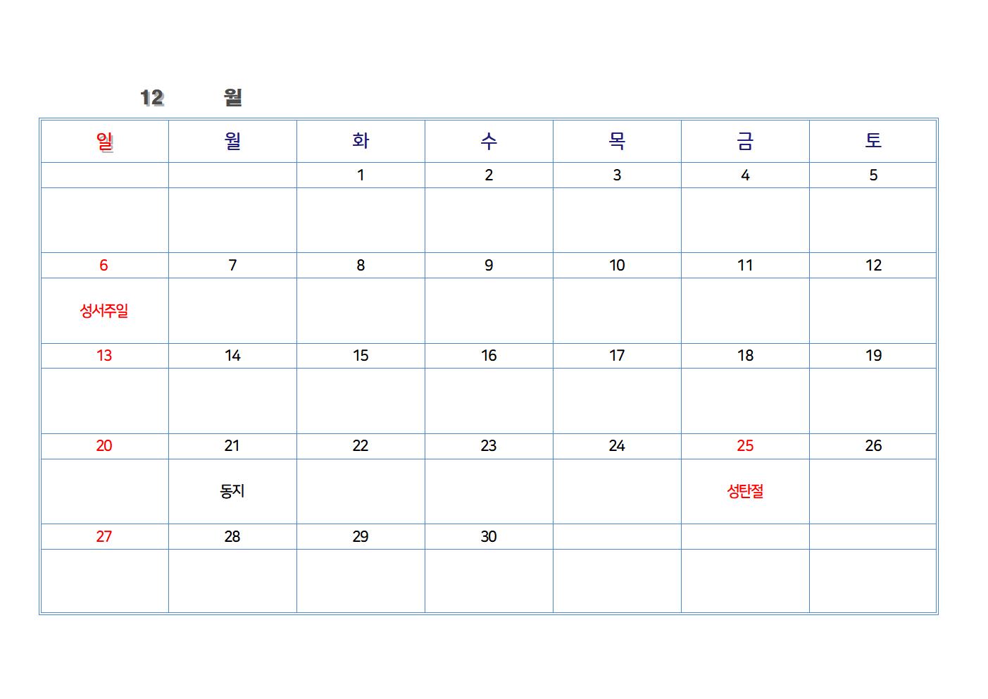 한글 파일로 만든 교회 달력입니다. 가장 기본적인 절기와 공휴일을 넣었습니다. 한글 파일을 가장 하단에 첨부했습니다. 다운로드하여 수정해 사용하시면 됩니다.